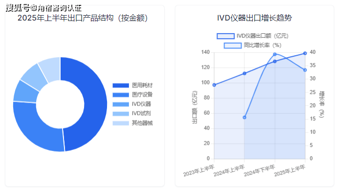 从增加趋向看,IVD仪器成为增加最疾的品类之一,出口额从2023年上半年的97.30亿元增至2025年上半年的138.93亿元,正在总出口额中的占比从6.27%晋升至7.75%。特别正在2024年下半年和2025年上半年,同比增速分袂达39.31%和33.42%,生长势头强劲。