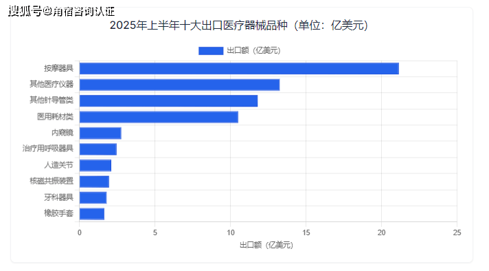2025年上半年,中邦对美邦出口的医疗东西金额同比增加7.3%。此中,口腔兴办与原料、医用敷料和一次性耗材出口额同比增幅均逾越两位数。其它,中邦打针器、臭氧仪、氧气调理仪、喷雾调理仪、高端敷料、药棉、纱布、绷带、医用手套、医用家具等细分产物对美邦出口增速明显。