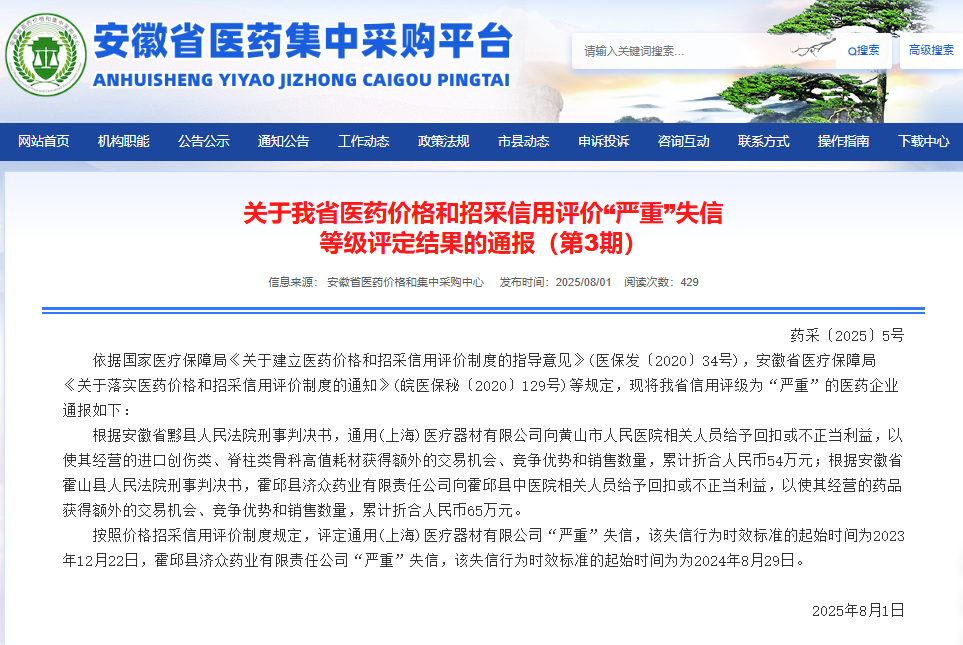 转达显示,依照安徽省黟县公民法院刑事占定书,通用(上海)医疗工具有限公司向黄山市公民病院闭连职员赐与回扣或不正当长处,以使其谋划的进口创伤类、脊柱类骨科高值耗材取得特别的交往时机、竞赛上风和发售数目,累计折合公民币54万元;遵守价值招采信用评议轨制规则,评定通用(上海)医疗工具有限公司“吃紧”失信,该失信举止时效轨范的肇始时辰为2023年12月22日。